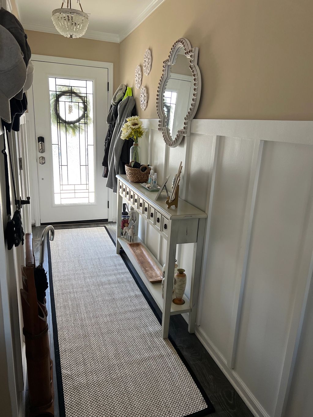 A long, narrow foyer can pose a special challenge. We created additional space by using small scale pieces and some detail on the walls.